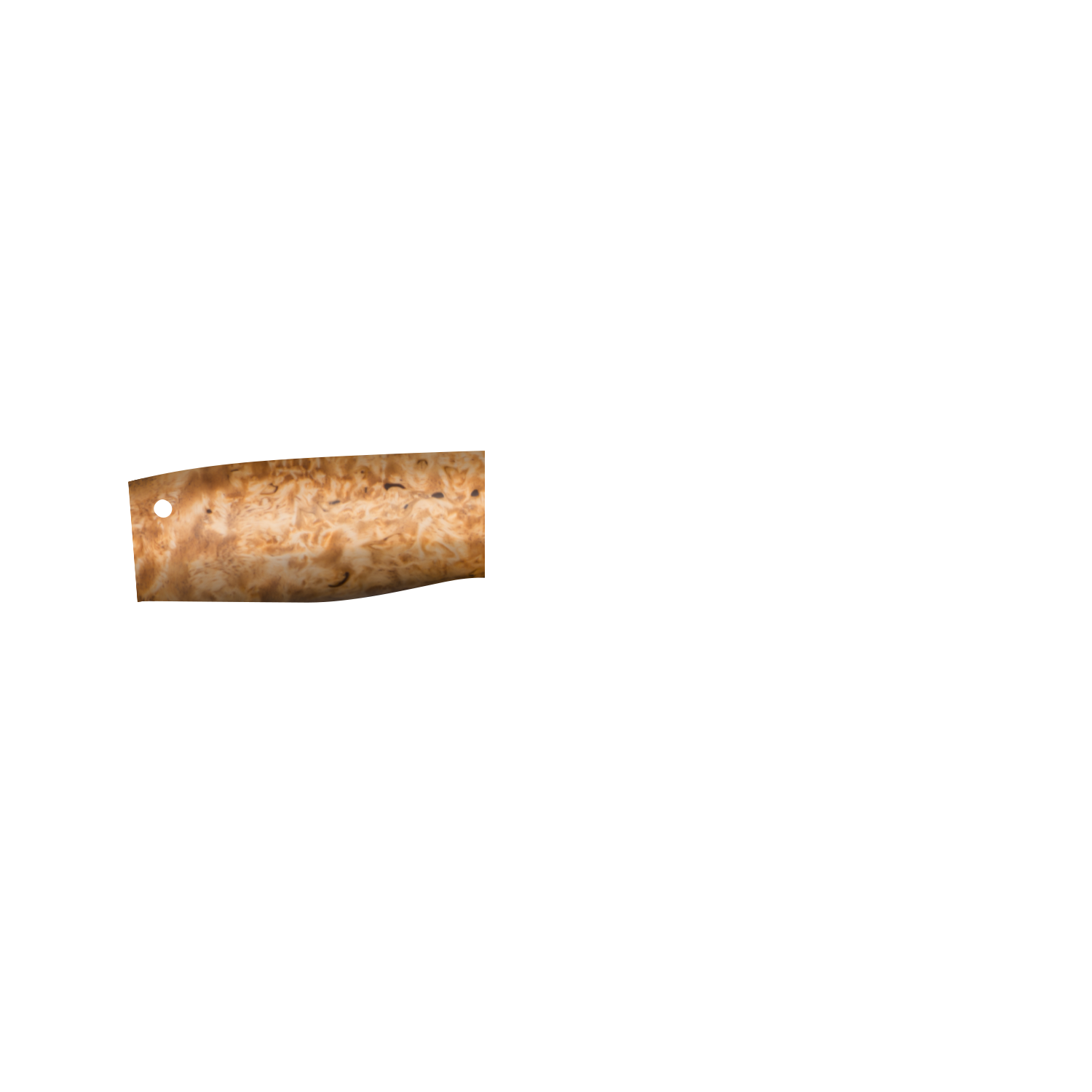 Универсальный легкий и прочный нож с мощным и изящным клинком, имеющим приспущенный обушок. При толщине пяты в 5 мм, за счет широкого фальшлезвия, не доходящего до острия 15 мм и широких плавных обратнолинзовидных спусков, клинок получился легким, с отличными режущими качествам. На обухе клинка у рукояти есть насечка для резов с упором большого пальца в обушок. Нож прекрасно сбалансирован. Эргономичная форма рукояти в скандинавском стиле уверенно и прочно ложится в любую ладонь, даже в рукавице. Небольшая подпальцевая выемка не дает соскользнуть пальцам при резах от себя. Монтаж рукояти всадной, неразборный. На рукояти ближе к навершию есть отверстие под темляк. Отличный выбор для большинства видов работы в лесу.