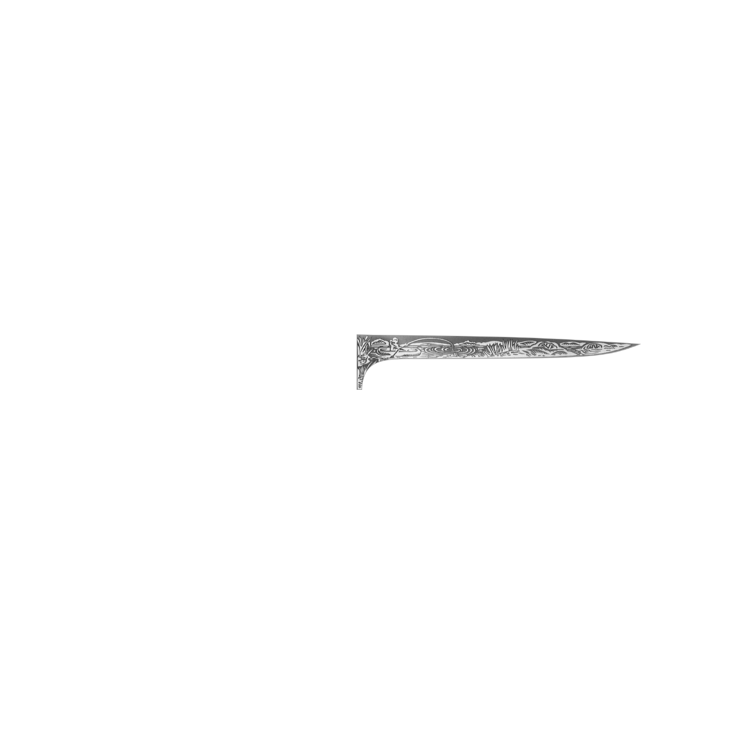 Средний по размерам, универсальный, легкий и прочный нож с клинком, имеющим чуть приспущенный к острию обушок. Вогнутые линзовидные спуски от половины ширины клинка образуют тонкое, изумительно режущее лезвие. Толщина обуха в 2,4 мм позволяет оставить приличную голомень, что придает ему дополнительную прочность. Клинок имеет довольно острый угол острия, что прекрасно подходит для вспарывания брюшка рыбы любой величины, через отверстие движением от себя в сторону нижней челюсти. Эргономичная форма рукояти идеально ложится в любую ладонь. Монтаж рукояти сквозной, неразборный. На навершии рукояти имеется отверстие под темляк. Замечательный выбор для любителей рыбной ловли.